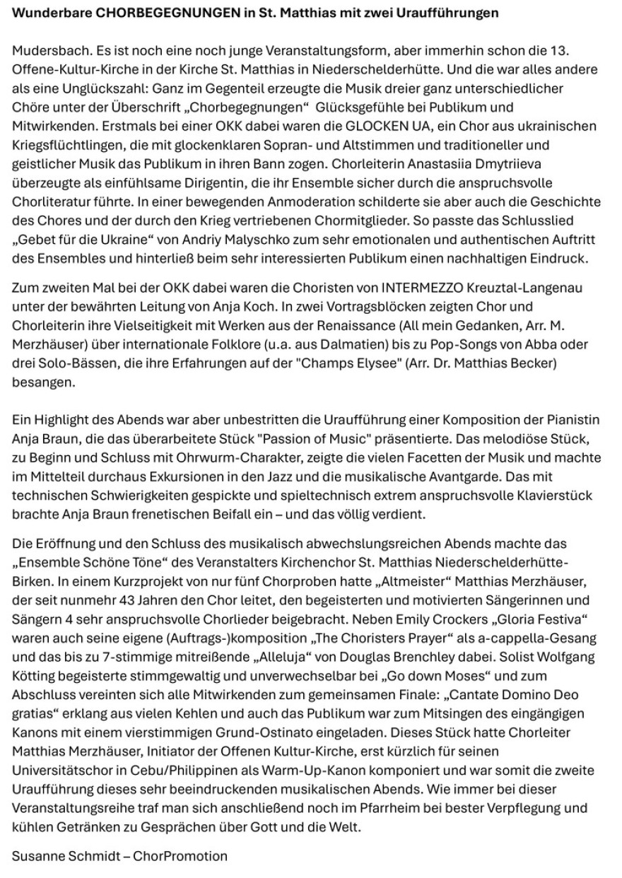 Pressemitteilung von unserem Konzert am 24.09.2025 in der "Offenen Kulturkirche" in Niederschelderhütte-Birken