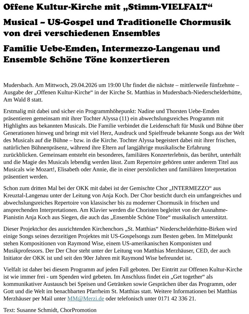 Im kommenden Jahr stehen 3 interessante Auftritte unterschied-lichster Natur an, die mit dem vorweihnachtlichen Konzert am 13.12.26 in der Kreuzkirche enden! „Schnuppern“ ist erwünscht um zu testen, ob es „passt“!